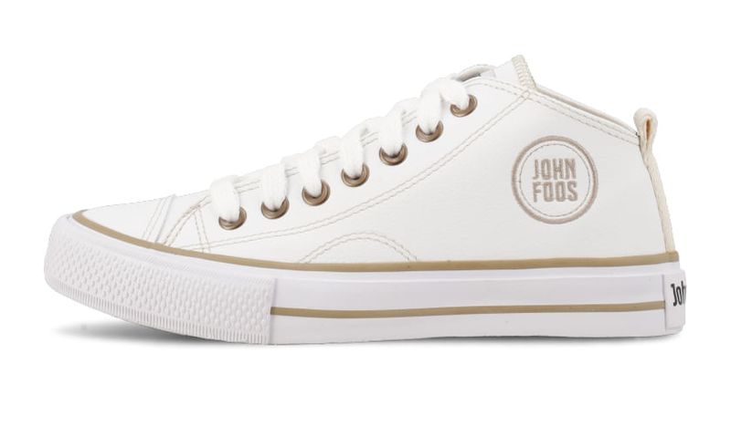Modelo icónico John Foos de la década del ´90, reeditado para el 40° aniversario de la marca. Zapatilla de media caña en cuero ecológico blanco con bordado de logo retro. Detalles: Capellada y caña en cuero ecológico blanco. Cinta de talón para calce en cuero ecológico color blanco. Forrería hecha 100% de microcanvas crudo. Etiqueta textil “heritage” blanca con logo y leyenda de la marca en color negro. Ojalillera de bronce. Cordones chatos 100% algodón crudo. Costuras hilo color beige. Plantilla extraíble confeccionada en caucho moldeado y base textil. Base de caucho vulcanizado color negro. Banda alta de caucho color blanco con doble filete color beige. Puntera y cierre de talón de caucho color blanco. Contrafuerte de caucho recuperado