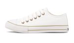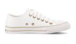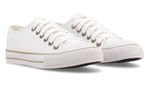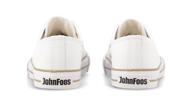 Zapatilla eco cuero blanco. Detalles: Capellada eco cuero full blanco. Forrería hecha 100% de algodón color blanco. Plantilla extraíble confeccionada en caucho moldeado y base textil. Cordones de algodón blancos. Etiqueta logo color suela en lengua. Ojalillera color bronce. Suela exterior y banda de caucho vulcanizado de alta resistencia. Buepe y contrafuerte de caucho