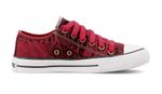 Zapatilla clásica de denim. Detalles: Capellada de denim lavado color rojo. ForrerĂa 100% de algodĂłn al tono. Etiqueta textil en lengua. Ojalillera color bronce. Cordones de algodĂłn al tono. Plantilla extraĂble de eva y base textil. Suela exterior y banda de caucho vulcanizado de alta resistencia. Contrafuerte y buepe de caucho.
