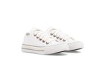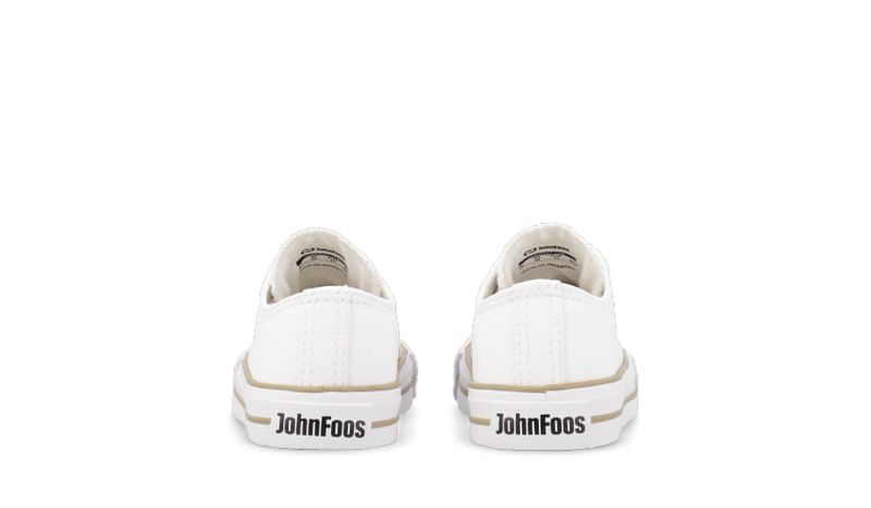 Zapatilla eco cuero blanco. Detalles: Capellada eco cuero full blanco. Forrería hecha 100% de algodón color blanco. Plantilla extraíble confeccionada en caucho moldeado y base textil. Cordones de algodón blancos. Etiqueta logo color suela en lengua. Ojalillera color bronce. Suela exterior y banda de caucho vulcanizado de alta resistencia. Buepe y contrafuerte de caucho