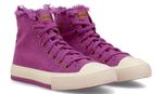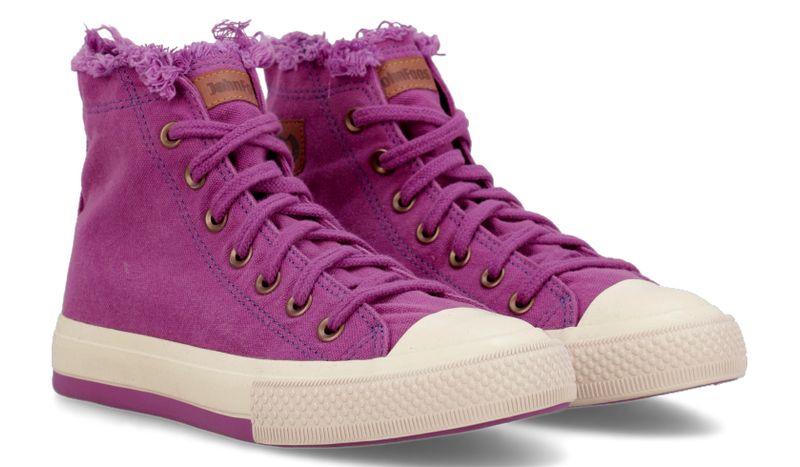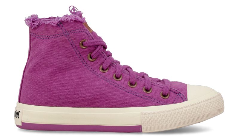 Detalles: Capellada en lona 100% algodĂłn color violeta. Forreria 100% de algodĂłn teñido color violeta. Cordones de algodĂłn color violeta. Etiqueta en lengua y etiqueta en lateral de eco cuero color suela con logo en bajo relieve. Ojalillos color bronce. Plantilla extraĂble de eva y base textil. Suela exterior de caucho vulcanizado de alta resistencia color violeta. Banda de caucho vulcanizado color crudo con detalle en color violeta. Contrafuerte de caucho recuperado.