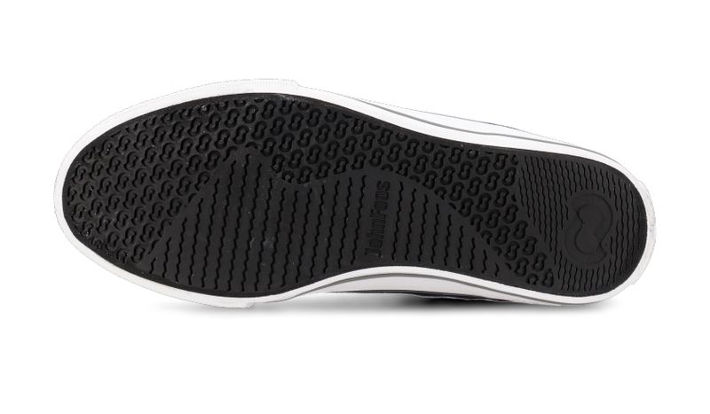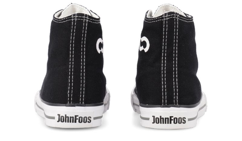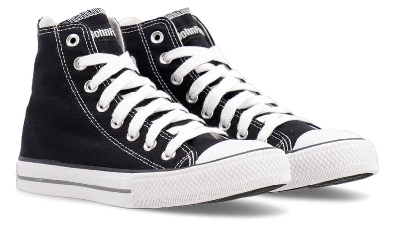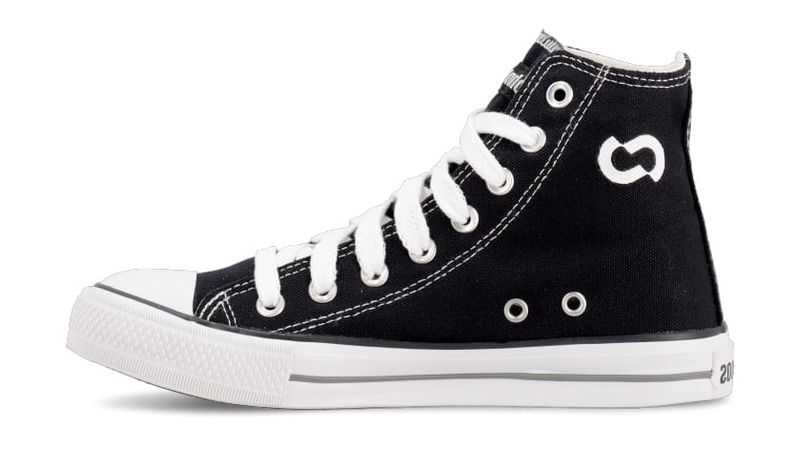 Capellada de lona negra . Forrería 100% de algodón blanco. Plantilla extraíble confeccionada en goma eva y base textil. Cordones de algodón blanco. Isologo con alta frecuencia en aplique de caña. Etiqueta textil con logo color blanco en lengua. Ojalillera de aluminio . Suela exterior y banda de caucho vulcanizado de alta resistencia. Contrafuerte y buepe de caucho