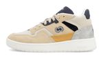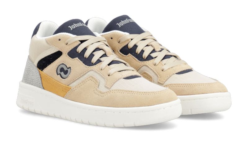 Zapatilla de caña intermedia. Detalles: Capellada con combinación de materiales textiles, ecocuero y descarne en colores beige, azúl, gris y mostaza. Logo en lateral externo color gris. Relleno espumado en cuello y forrería de poliéster 100% bondeada de color blanca. Plantilla extraíble de espuma de poliuretano y base textil para mayor comodidad y transpirabilidad. Cordones de poliéster color beige. Lengua con pasa cordón y logo estampado en la parte superior. Contrafuerte de caucho recuperado. Suela exterior de caucho moldeado de alta resistencia con entresuela de phylon, color tiza.