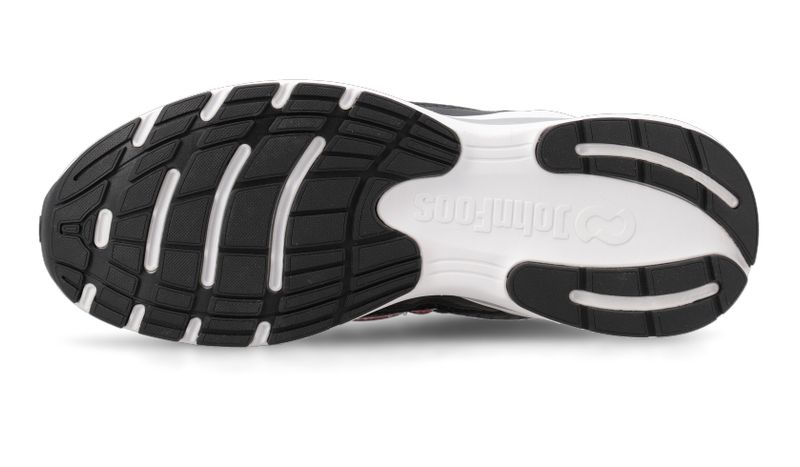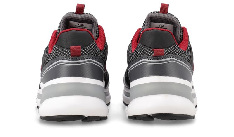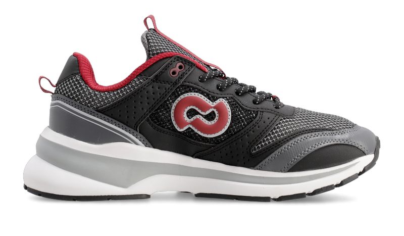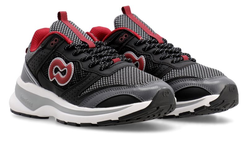 Detalles: Capellada en tejido de poliéster color negro y gris y forrería color bordo. Relleno mullido a lo largo del cuello para una sensación de mayor confort. Recortes de capellada en ecocuero negro y gris. Cordones de nylon redondos color negro con puntitos blancos. Isologo lateral aplicado con costura en color bordo y blanco. Plantilla extraíble de eva termoformada y base textil color negro. Base de eva color blanco con detalle en color gris y suelín de caucho color negro.